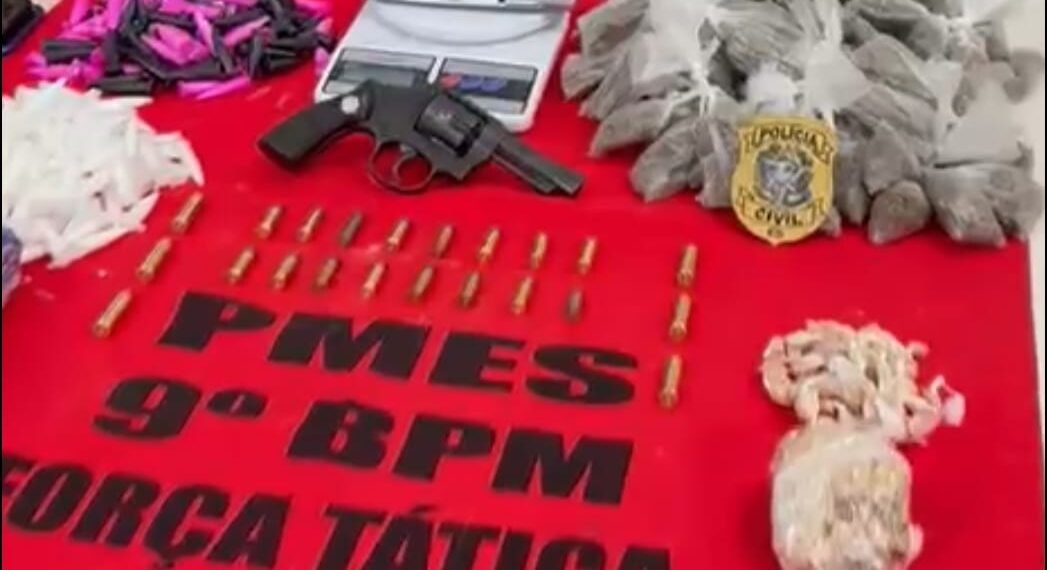 Nesta terça, em Castelo/ES, uma operação conjunta PMES x PCES, cumpriu mandado de prisão e busca e apreensão. Na Rua Dr. Adalton Santos, s/n, Niterói, Castelo/ES, policiais detiveram no Beco dos Santos, R. A. P, com 1 pino de cocaína cheio, 53 pinos vazios e 46 pedras de crack. O alvo era M. J. d. S. e o material apreendido (mochila) em área de mata com auxílio de cão de faro, 135 pinos de cocaína, 206 buchas de maconha e uma 2 balanças de precisão.